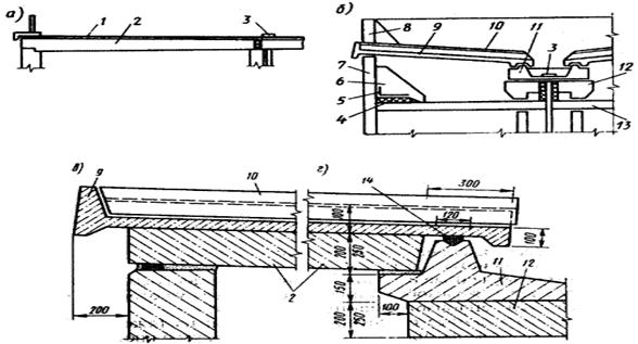 Рис. 14. Сборные железобетонные крыши бесчердачная (а), чердачная (б) и варианты карнизного (в) и лоткового (г) узлов мастичных кровель: