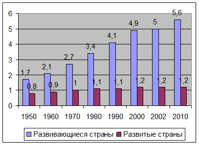 Рис.3: Изменение численности населения развитых и развивающихся стран, 1950-2010, миллиардов человек.