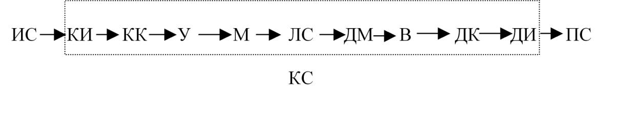 ДК – декодер канала. Выявляет и/или исправляет ошибки, допущенные при передаче сигнала по линии связи ЛС. Присутствует в схеме только при наличии кодера канала КК.