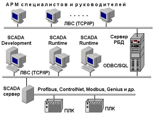 С другой стороны, SCADA-системы должны поддерживать интерфейс и со стандартными информационными сетями (Ethernet и др.) с использованием стандартных протоколов (TCP/IP и др.) для обмена данными с компонентами распределенной системы управления.