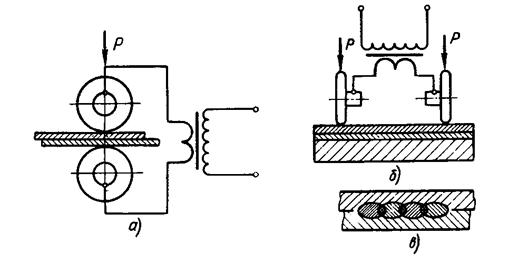 | Рис.24. Шовная сварка а - схема сварки между роликами; б - схема сварки между роликами и оправкой; в - зона сварки |