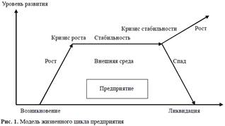 Модель жизненного цикла предприятия представляет собой ломаную линию с определёнными точками перегиба (переломными моментами). Это своего рода стадии или периоды, которые можно разделить на длинные или основные и короткие, или промежуточные. Длинные периоды на графике жизненного цикла можно обозначить как линии (стадии), короткие как точки (переломы). В целом модель жизненного цикла предприятия представляет собой последовательность: возникновение (перелом) – рост (стадия) – кризис роста (перелом) – стабильность (стадия) – кризис стабильности (перелом) – спад (стадия) – ликвидация (перелом). Это можно представить в виде рисунка 1.