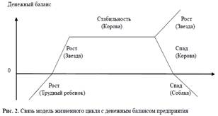 Жизненный цикл предприятия тесно связан с финансовыми потоками. После возникновения и регистрации предприятия начинается его рост. На этой стадии требуются большие финансовые вложения в организацию производства, которые постепенно начинают перекрываться поступлениями от реализации продукции. На этой стадии нередко используются венчурные вложения – средства венчурных компаний и фондов. Денежный поток на этой стадии отрицательный, но абсолютная величина «минуса» постепенно уменьшается. По классификации «Матрица БКГ» предприятие представляет собой «Трудный ребенок».