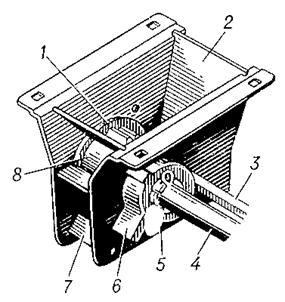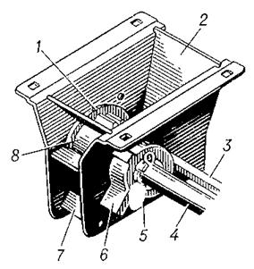 Рис. 1. Катушечный высевающий аппарат: 1 — катушка; 2 — корпус (коробка); 3 — валик клапанов дляопоражнивания коробки от семян; 4 — приводной валик катушки высевающих аппаратов; 5 —регулировочная шайба; 6 — муфта; 7 — донышко; 8 — розетка.