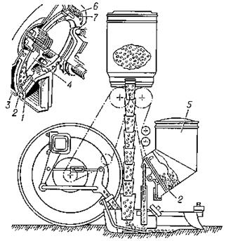 рабочий орган сеялок для высева семян с.-х. культур. Наиболее распространены В. а. катушечные,дисковые, ячеисто-дисковые и мотыльковые. Катушечный В. а. (рис. 1) состоит из расположенной в корпусерифлёной катушки, насаженной на вращающийся вал, розетки, невращающейся муфты. Вращающаясякатушка сбрасывает семена в семяпровод, по которому они поступают в сошник и падают в сделаннуюпоследним бороздку. В зависимости от направления вращения катушки различают В. а. с нижним и верхнимвысевом. Катушка В. а. с нижним высевом выбрасывает семена из нижней части коробки. В. а. с верхнимвысевом отличается тем, что верхние желобки катушки выносят семена из верхней части коробки. Обычно В.а. с нижним высевом применяют для высева семян пшеницы, ржи, овса, ячменя. Для высева крупных и легкоповреждаемых семян применяют В. а. с верхним высевом. Дисковый В. а. (рис. 2) используют в квадратно-гнездовых и пунктирных сеялках. Он состоит из цилиндрической банки, в откидном дне которойсмонтированы высевающий диск, отражатель и выталкиватель. Для высева 1 или 2 калиброванных семян вгнездо на высевающий диск укладывают накладки. Отражатели счищают лишние семена, неправильнорасположившиеся в ячейках вращающегося диска, а выталкиватель выталкивает семена, которые взависимости от положения клапана-делителя падают в левый или правый копильник сошника и из него вбороздку. Ячеисто-дисковый В. а. (рис. 3) предназначен для точного высева по одному зерну семянсахарной свёклы, кукурузы, хлопчатника и других культур. В. а. имеет семенную банку, ячеистый диск,кронштейн-днище, ролики-выталкиватели, козырёк-отражатель. Ячейки вертикально расположенноговращающегося диска заполняются семенами, отражатель счищает их с верхней части диска, лишние семенавыпадают из верхних ячеек. Выталкиватели выталкивают семена из ячеек диска в семяпровод. МотыльковыйВ. а. применяют для высева малосыпучих семян трав, овощных и лесных культур, для высева удобрений. В.а. состоит из валика с насаженными на нём мотыльками-звёздочками с лопастями, обычно расположеннымипод углом к плоскости вращения. Мотыльки, вращаясь, ворошат и выталкивают семена через отверстия,имеющиеся в стенке семенного ящика, в семяпроводы. Для разрушения сводов малосыпучих семян,образующихся в ящике, над мотыльками размещают ворошилки. Сеялки прежних выпусков снабжалищёточными, канатиковыми, внутренне-ребёрчатыми и другими В. а.