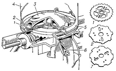 Рис. 2. Дисковый высевающий аппарат: 1 — высевающий диск; 2 и 7 — накладки; 3 — дно; 4 —семенная банка; 5 — крышка; 6 — клапан-делитель.