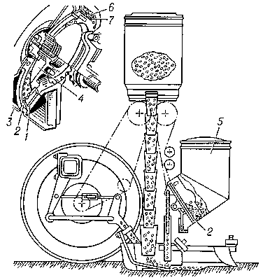 Рис. 3. Ячеисто-дисковый высевающий аппарат: 1 — опорный диск; 2 — высевающий диск; 3 —кронштейн-днище; 4 — ведущий диск; 5 — семенная банка; 6 и 7 — ролики-выталкиватели.