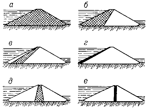 б — из разнородных грунтов (с водонепроницаемой верховой призмой)