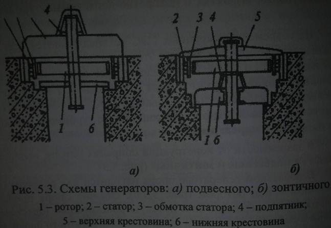 В зависимости от опирания ротора, генераторы подразделяются на подвесные и зонтничные.