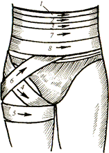 В верхней части живота укрепляющие круговые туры накладывают в нижних отделах грудной клетке. Бинтуют живот спиральными ходами сверху вниз, закрывая область повреждения. В нижней части живота фиксирующие туры накладывают в области таза над лонным сочленением и ведут спиральные туры снизу вверх.