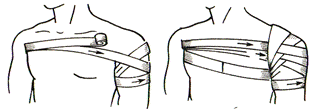 Бинтование начинают с круговых закрепляющих туров в верхнем отделе плеча, затем бинт ведут на надплечье и по спине к подмышечной области противоположной стороны. Далее – по передней стороне груди на переднюю поверхность плеча, по наружной поверхности вокруг плеча в подмышечную ямку, с переходом на наружную поверхность плечевого сустава и наплечеье. Затем туры бинта повторяются со смещением вверх на 1/3 или ½ ширины бинта. Заканчивают круговыми турами вокруг грудной клетки.