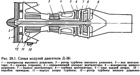 Модульные двигатели (рис. 28.1) обладают определенными преимуществами при техническом обслуживании. Они обладают высокой контролепригодностью, доступностью, взаимозаменяемостью. При техническом обслуживании и ремонте не требуется съем и разборка всего двигателя, а только того модуля, где обнаружена неисправность. Легкость и быстрота съема модулей обеспечивается надежным, легкодоступным стационарным креплением агрегатов модулей, применением легкоразъемных трубопроводов, болтов соединений корпусов модулей, хомутов, минимальными требованиями по балансировке и применением встроенных в модули подшипников.