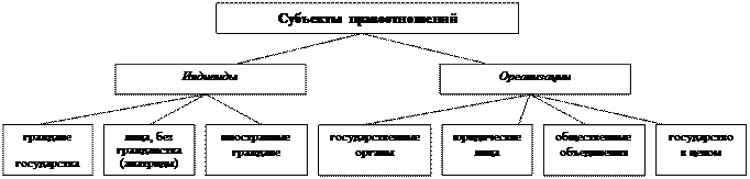 Это участники правоотношений, имеющие субъективный права и юридические обязанности. К их числу относятся индивиды и организации (см. схему 31).