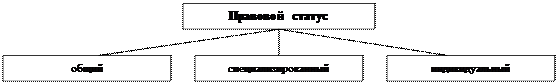 Каждый субъект права обладает общим правовым статусом (см. схему 32). Это совокупность право и дееспособности, необходимых для возникновения конкретных правоотношений, а также общих прав и обязанностей, реализация которых не порождает конкретные правоотношения (свобода слова, обязанность исполнять законы и др.). Он в принципе един для всех граждан. Кроме того существует понятие индивидуального правового статуса - совокупность правоотношений, стороной которых выступает то или иное лицо. Такой статус различен для конкретных индивидов. Наконец, есть понятие специализированного правового статуса, под которым понимается совокупность прав и обязанностей определенной категории субъектов (пенсионеры, военнослужащие, лица с высшим медицинским образованием и др.).
