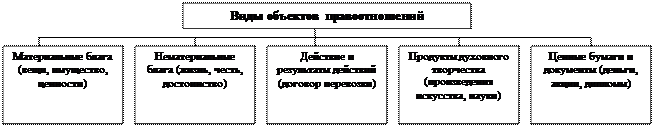 В результате, можно выделить следующие виды объектов правоотношений в зависимости от характера и видов правоотношений (с входящими в них субъективными правами и юридическими обязанностями) (см. схему 33):