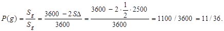 Т.о. если g – часть области G, то вер-ть попадания в обл-ть g по определению= Р(g)= мера g/мераG. Заметим, что здесь пр-во Ω всех элементарных исходов представляет собой сов-ть всех точек области G и значит состоит из бесконечного множества элементарных событий=>понятие «геом. Вер-ть» можно рассматривать как обобщение понятия «классич. Вер-ть» на случай опытов с бесконечным числом исходов.