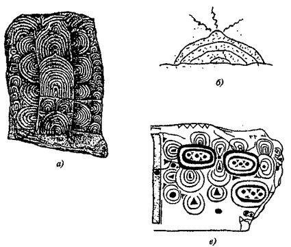 а) изображение на плитах гробницы Гаврини. Морбиан, Бретань; б) изображение в гробнице Иль Лонг; в) орнамент бордюрного камня кургана Ньюгрейндж. Мит. Ирландия