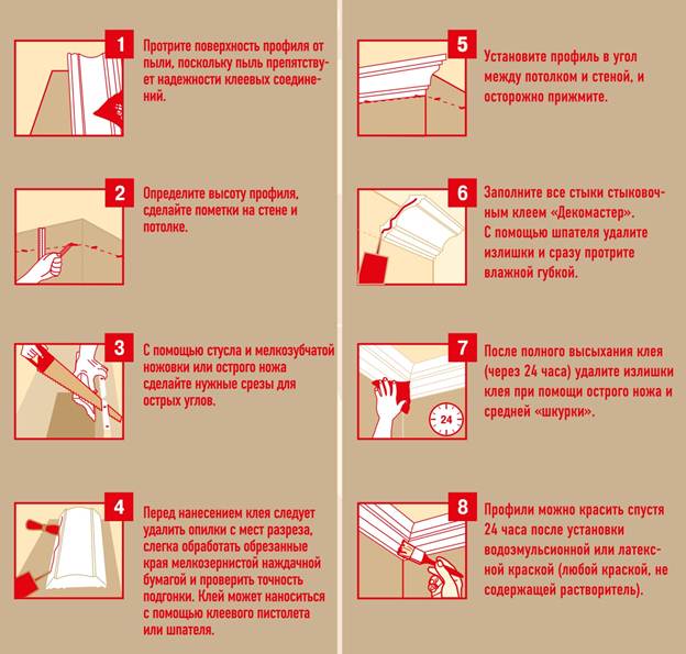 · Для обеспечения качественного крепления профиля не следует допускать перепадов температур и влажности между условиями хранения и монтажа (перед началом монтажа необходимо в течение суток выдержать декоративные элементы и клеи в помещении, предназначенном для монтажа)