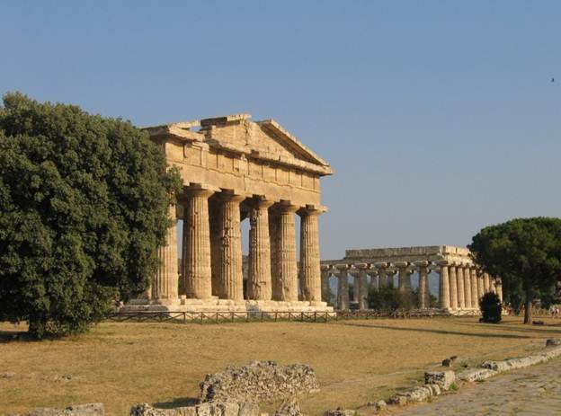 Храм Геры I был воздвигнут в середине VI века до н.э. Путешественники XVIII века называли его «Базиликой», так как считали его не храмовым, а общественным сооружением. Действительно, пропорции здания и его планировка сильно отличаются от классического периптера. Соотношение колонн здесь 9: 18