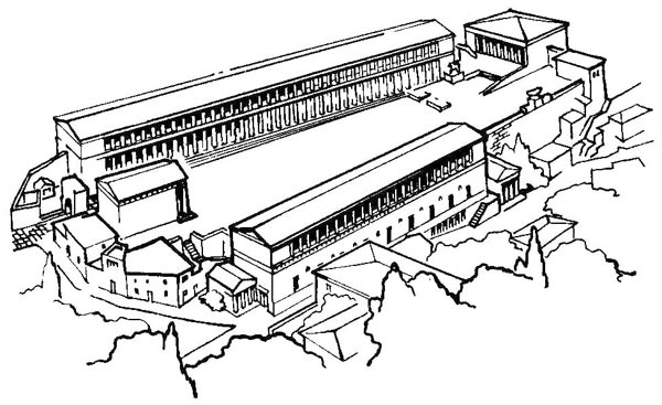 К XII в. до н. э. распад микенского государства и упадок его культуры были ускорены нашествием дорян. Несмотря на разрушение крито-микенской культуры дорийскими племенами, она послужила ступенью в формировании античной культуры Восточного Средиземноморья. Центром античной греческой культуры стал Балканский полуостров. Здесь в результате вторжений и перемещений ахейских, дорийских, ионийсних и других племен (получивших общее название эллины) складывается рабовладельческая форма хозяйства, укрепившая различные области экономики: ремесло, торговлю, земледелие. Развитие экономических связей эллинского мира способствовало его политическому сплочению; предприимчивость мореходов, заселявших новые земли, благоприятствовала распространению греческой культуры, ее обновлению и совершенствованию, созданию различных местных школ в едином русле общеэллинской архитектуры. В результате борьбы демоса (свободного населения городов) против родовой аристократии складываются государства — полисы, в управлении которыми принимают участие все граждане. Демократическая форма правления способствовала развитию общественной жизни городов, формированию различных общественных учреждений, для которых строили залы собраний и пиров, здания совета старейшин и др. Их размещали на площади (агоре), где обсуждались важнейшие городские дела, совершались торговые сделки. Религиозным и политическим центром города был акрополь, расположенный на высоком холме и хорошо укрепленный. Здесь строили храмы наиболее почитаемых богов—покровителей города.