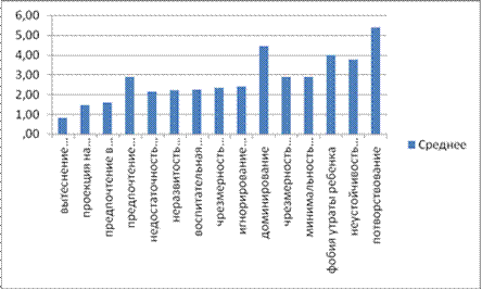 Были обнаружены следующие особенности стилей воспитания. Потворствование (5,40±2,037) родители стремятся к максимальному удовлетворению любых потребностей подростка, балуют его. Любое его желание для них — закон, «слабость» ребенка, его исключительность, желание дать ему то, чего в свое время был лишен сам родитель. Доминирование (4,45±2,038) ребенок также в центре внимания родителей, которые отдают ему много сил и времени. Однако в то же время лишают его самостоятельности, ставя многочисленные ограничения и запреты. Фобия утраты ребенка (4,00±2,128) "Слабое место" - повышенная неуверенность, боязнь ошибиться, преувеличенные представления о "хрупкости" ребенка, его болезненности. Неустойчивость стиля воспитания (3,75±1,209). Предпочтение мужских качеств (2,90±1,917), чрезмерность санкций (2,90±1,447), минимальность санкций (2,90±1,021), игнорирование потребностей подростка (2,40±0,940) (где интерпретация?), чрезмерность требований (2,35±1,268) подростку предъявляется огромное количество требований, ограничивающих его свободу и самостоятельность, воспитательная неуверенность родителей (2,25±1,585), неразвитость родительских чувств (2,20±1,196) (где интерпретация?), недостаточность обязанностей подростка (2,15±1,348), предпочтение в подростках детских качеств (1,60±0,995), проекция на ребенка собственных нежелательных качеств (1,45±1,234) (где интерпретация?).