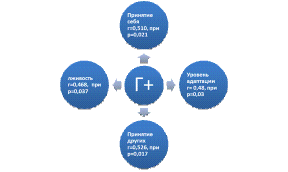 - между стилем воспитания «гиперпротекция положительная» и следующими особенностями социально-психологической адаптации подростка: принятие других (г=0,526, при р=0,017), принятие себя (г=0,510, при р=0,021), уровень адаптации (г= 0,484, при р= 0,030), лживость (г=0,468, при р=0,037).