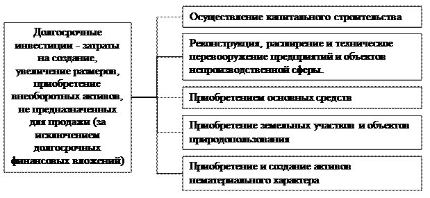 Понятие «долгосрочные инвестиции» охватывает капитальные вложения (затраты на воспроизводство основных средств), затраты, связанные с приобретением земельных участков и объектов природопользования, и затраты по приобретению и созданию нематериальных активов.