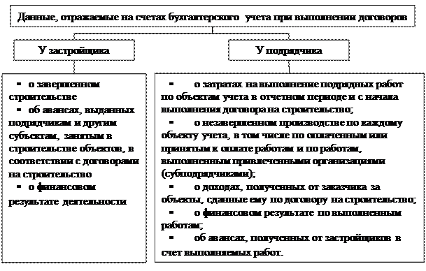 Следует четко разграничивать учетные данные, отражаемые при выполнении договоров на строительство на счетах бухгалтерского учета у застройщика и у подрядчика (рис. 2.8).