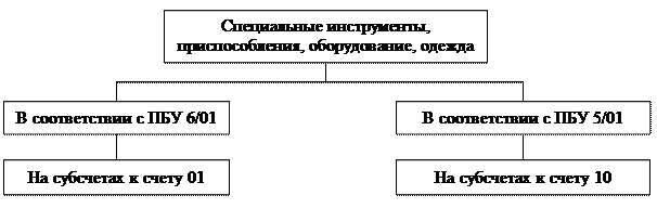Бухгалтерский учет специальной оснастки может быть организован по аналогии с порядком, предусмотренным для основных средств, в соответствии с ПБУ 6/01 «Учет основных средств» (на счете 01 «Основные средства») или в соответствии с ПБУ 5/01 (на счете 10 «Материалы», к которому открываются субсчета «Специальная оснастка и специальная одежда на складе» и «Специальная оснастка и специальная одежда в эксплуатации»).