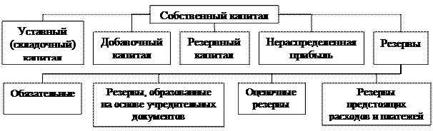 В п. 66 Положения по ведению бухгалтерского учета и отчетности в Российской Федерации перечислены источники средств организации, которые учитываются в составе собственного капитала: уставный (складочный), добавочный и резервный капитал, нераспределенная прибыль и прочие резервы (рис. 13.1).