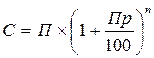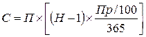 | где: С – сумма начисленных процентов; П – сумма привлеченных денежных средств; Н – количество календарных дней привлечения кредитных ресурсов; Пр – годовая процентная ставка; n – количество периодов. |
