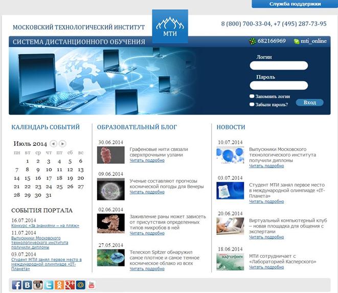 Рис.1. Главная страница Системы дистанционного обучения НОУ ВО Московский технологический институт 2.2. Основным учебным пособием по каждой дисциплине является хрестоматия, состоящая из набора модулей (разделов). Кроме хрестоматии студент получает доступ к полнотекстовым ресурсам электронной библиотеки Московского технологического института по каждой изучаемой дисциплине. На настоящий момент библиотека насчитывает более 20 000 экземпляров. 2.3. Доступ ко всем ресурсам, обеспечивается через СДО Московского технологического института по атрибутам выданным студенту после выхода приказа о зачисления в Московский технологический институт. Кроме доступа к ресурсам, студент получает доступ к учебному форуму по изучаемой дисциплине. В форуме любой студент может задать вопрос преподавателю. 2.4. Дополнительно студент имеет доступ к факультативным вебинарам и форумам, в котором может обсудить вопросы организационного и учебного характера. При обучении по любой форме обучения (кроме экстерната), доступные в СДО Московского технологического института дисциплины для изучения определяются учебным планом и семестром, на котором находится студент. 2.5. При обучении в экстернате студенты самостоятельно определяют темп изучения дисциплин в порядке, заданном личным аттестационным планом программы ВПО (бакалавриат, магистратура) по избранному направлению подготовки и специализации с последующей аттестацией (текущей и итоговой) в Московском технологическом институте (в соответствии с «Положением об экстернате в государственных, муниципальных высших учебных заведениях Российской Федерации»). Экстерн имеет возможность сделать заказ на изучение дисциплин, в соответствии с его личным аттестационным планом. Контроль за правильностью заказа и его соответствие аттестационному плану осуществляется специалистами учебного отдела Московского технологического института. 2.6. Критерии оценки в системе СДО: - менее или 50% правильных ответов на тестовые задания соответствуют оценке «неудовлетворительно»;- от 51% до 74% правильных ответов на тестовые задания соответствуют оценке «удовлетворительно»;- от 75% до 90% правильных ответов на тестовые задания соответствуют оценке «хорошо»;- от 91% до 100% правильных ответов на тестовые задания соответствуют оценке «отлично». 2.7. Все студенты, по мере изучения модулей хрестоматии по конкретной дисциплине, проходят Промежуточный контроль знаний после каждого модуля в виде тестирования (Тренинг-Контроль, количество попыток на сдачу не ограничено). По окончании изучения дисциплины студент допускается к Контрольному заданию по дисциплине и Итоговому тестированию 2.7.1. На итоговое тестирование по дисциплине отводится три попытки, на каждую попытку отводится от 30 до 45 минут (в зависимости от дисциплины);2.7.2. Ограничение между сдачей Итогового тестирования (по любой дисциплине) 3 дня (72 часа);2.7.3. На сдачу Итогового тестирования отводится 10 дней (с момента открытия первой попытки). Пример: если Вы сдали Итоговое тестирование по Философии 01.09.2012 в 9:00, то приступить к следующей попытке Итогового тестирования по Философии или по любой другой дисциплине, например, по Психологии Вы сможете только через 72 часа, то есть 04.09.2012 в 9:01. На пересдачу Философии (если оценка Вас не устраивает) отводится период с 01.09.2012 по 11.09.2012 до