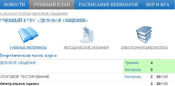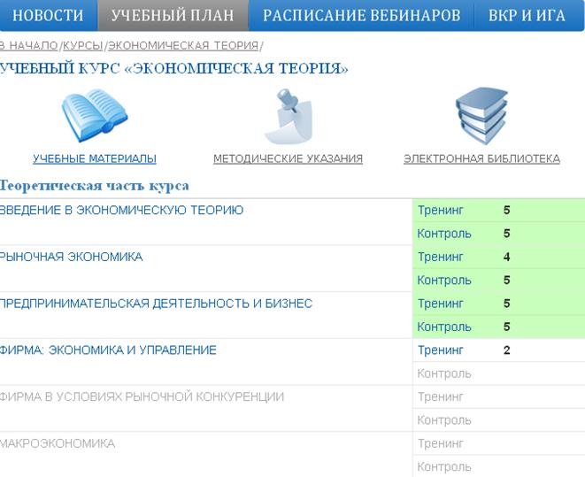 3.4.2. Для успешного прохождения итогового тестирования студент должен пройти тренировочные тестирования (Тренинг) по модулям. Модули, учебного курса, изученные студентом отмечаются зеленым цветом в полях Тренинг и Контроль, проставляется оценка. Модули, недоступные для изучения являются не активными ссылками в поле Тренинг и Контроль.