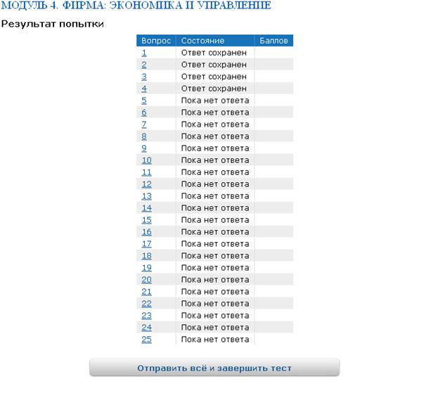 2) После прохождения всего теста нужно нажать кнопку «Далее» или «Завершить попытку», при этом программа формирует промежуточный отчет по зафиксированным вариантам ответа, если Вы полностью хотите завершить попытку Вам нужно нажать кнопку «Отправить всё и завершить тест».