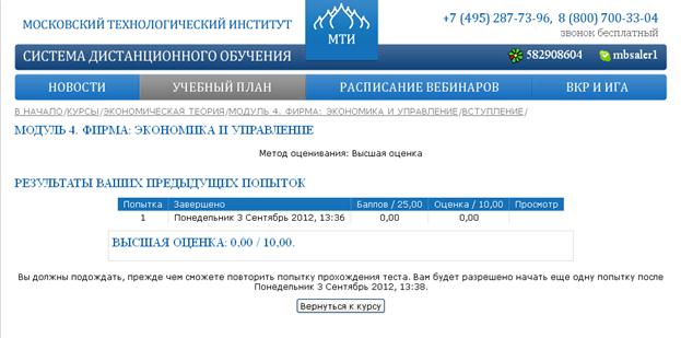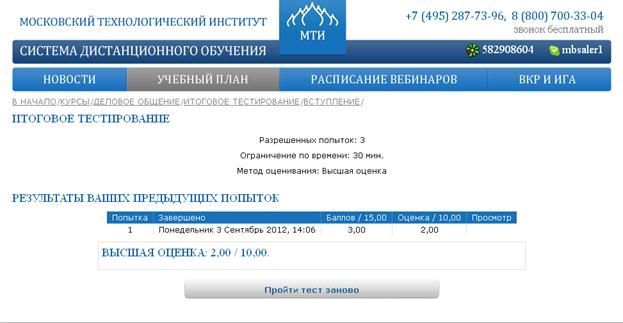 3.7.9. В случае получения студентом третьей неудовлетворительной оценки за итоговое тестирование, надпись в верхней части протокола проинформирует студента о необходимости обратиться в установленном порядке к администрации Московского технологического института.