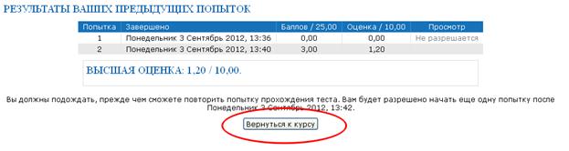 «Вы должны подождать, прежде чем сможете повторить попытку прохождения теста. Вам будет разрешено начать еще одну попытку после Понедельник 3 Сентябрь 2012, 13:38.»