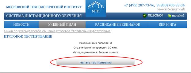 3.6.2. Для того чтобы приступить к тестированию надо нажать на кнопку «Начать тестирование».