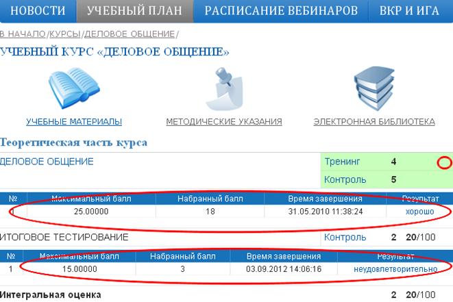 (зеленый треугольник, расположенный справа от поля «Тренинг», на рис. 20-21 показаны примеры просмотра статистики по сданной дисциплине.)