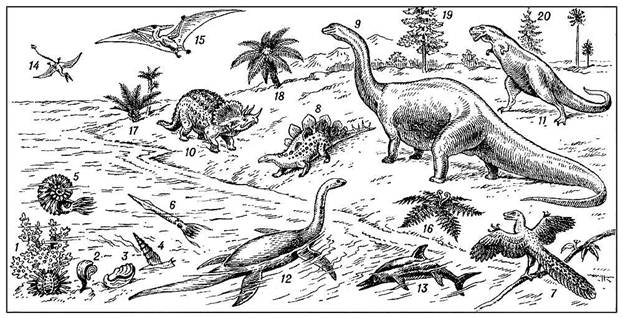 Рис. 5. Жизнь в мезозое: 1-шестилучевые кораллы, 2-иглокожие, 3-6-моллюски (3-двустворчатый, 4-брюхоногий, 5-аммонит, 6-белемнит), 7-археоптерикс, 8-11-динозавры наземные (8-стегозавр, 9-диплодок, 10-трицератопс, 11-тиранозавр), 12-13-динозавры водные (12-плезиозавр, 13-ихтиозавр), 14,15-динозавры летающие - птерозавры (14-рамфоринх, 15-птеронодон), 16- папоротники, 17-бененеттиты, 18-цикадовое, 19-гинкго, 20-голосеменные.