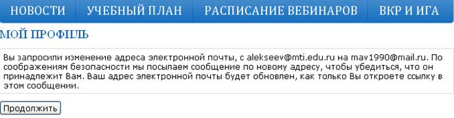 «Вы запросили изменение адреса электронной почты, с alekseev@mti.edu.ru на mav1990@mail.ru. По соображениям безопасности мы посылаем сообщение по новому адресу, чтобы убедиться, что он принадлежит Вам. Ваш адрес электронной почты будет обновлен, как только Вы откроете ссылку в этом сообщении».