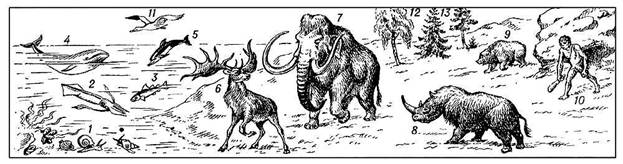Рис. 7. Жизнь в антропогене: 1,2-моллюски (1-брюхоногие, 2-головоногий – кальмар), 3-рыба, 4,5-китообразные (4-кит, 5-дельфин), 6-большерогий олень, 7-мамонт, 8-носорог, 9-пещерный медведь, 10-человек разумный, 11-птица, 12-цветковые растения - береза, 13-хвойные растения – ель и сосна.