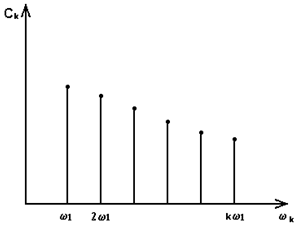Набор частот wk называют спектром функции f(t). В данном случае спектр - дискретный. Приближенный метод разложения в ряд Фурье для непериодической функции состоит в применении предельного перехода при T ® ¥. Действительно, непериодическую функцию можно рассматривать как периодическую при неограниченно возрастающем периоде.