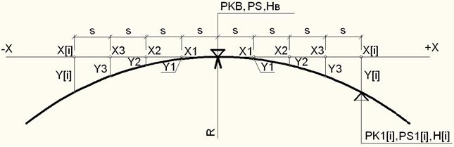 Дано: пикетное положение (РКВ и PS) и отметка вершины кривой (НВ), вид кривой «выпуклая» или «вогнутая», шаг разбивки (S) и число рассматриваемых точек (N) вправо или влево от вершины, радиус кривой (R). Требуется вычислить пикетное положение этих точек и их отметки, округлив их до 0,01 (рис.9.1).