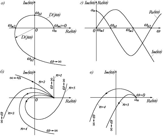 Характеристические кривые, соответствующие устойчивым системам, имеют плавную спиралеобразную форму и уходят в бесконечность в том квадранте, номер которого равен порядку уравнения (рис.1.2, б.). Если характеристическая кривая проходит n квадрантов не последовательно или проходит меньшее число квадрантов, то система неустойчива (рис.1.2, в.). Если кривая F(jw) проходит через начало координат, то система находится на границе устойчивости. В практических расчетах удобно применять