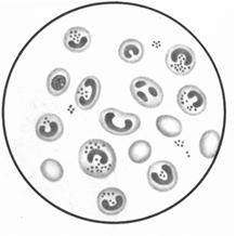 3. Определение фагоцитарной активности нейтрофилов (завершенный фагоцитоз стафилококка). Фагоцитоз - это поглощение лейкоцитами и макрофагами микробов, чужеродных частиц, "обломков" погибших клеток, иммунных комплексов (конгломерат антитело + антиген). Фагоцитоз может заканчиваться перевариванием микробов - завершенный фагоцитоз. В пробирку помещают 0,1 мл 2% раствора лимоннокислого натрия, 0,2 мл исследуемой крови, 0,1 мл взвеси тест - культуры стафилококка (концентрация 400 млн. микробных тел в 1 мл), содержимое пробирки тщательно перемешивают и помещают в термостат при 37°С на 30 мин. Затем пробирки центрифугируют и из сероватой пленки на границе плазмы и эритроцитов готовят мазки, которые фиксируют в смеси Никифорова и окрашивают по Романовскому-Гимза. Микроскопируют с использованием иммерсионной системы. Определяют фагоцитарную активность лейкоцитов (ФА - процент фагоцитирующих клеток при подсчете 100 фагоцитов) и фагоцитарный показатель (ФП - число микробов, поглощенных одним лейкоцитом – рис. 13). У здоровых лиц ФП составляет 5-9, ФА - 50 – 70%.