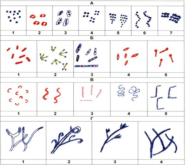 | | Рис. 5. Морфология микробов. А – кокки (1 – микрококки, 2- диплококки: гонококки и менингококки, 3 – диплококки: пневмококки, 4 – тетракокки, 5 – стафилококки, 6 – стрептококки, 7 - сарцины); Б - палочки (1 – энтеробактерии, 2 – дифтерийная палочка, 3 – сибиреязвенная палочка, 4 – палочка чумы, 5 - столбнячная палочка); В – извитые формы (1 – холерный вибрион, 2 - спириллы, 3 – бледная трепонема, 4 –боррелии, 5 – лептоспиры); Г – актиномицеты (1, 2- прямые спороносцы, 3- непрямые спороносцы, 4 – одноклеточный мицелий) | |