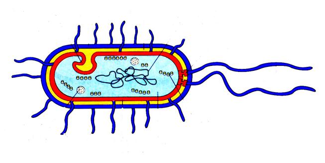 | Рис. 13. Ультраструктура бактериальной клетки. 1 - капсула, 2 - оболочка, 3 - цитоплазматическая мембрана, 4 - нуклеоид, 5 - базальное тело, 6 - жгутики, 7 -рибосомы, 8 -цитоплазма, 9 - пили, 10 – включения, 11- мезозома |