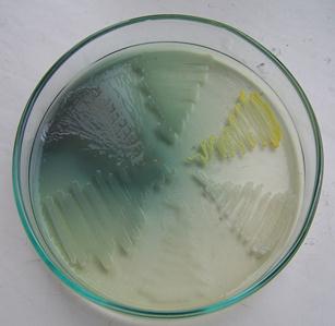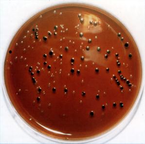 | Рис. 23. Лактозопозитивные и лактозонегативные колонии энтеробактерий на среде Левина |