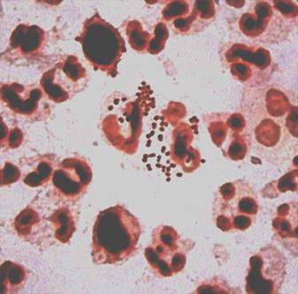| Рис. 35. Незавершенный фагоцитоз гонококка |