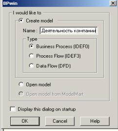 3. Появляется диалог I would like to (рис.3). Внесите имя модели "Деятельность компании" и выберите Type – IDEF0. Нажмите ОК.